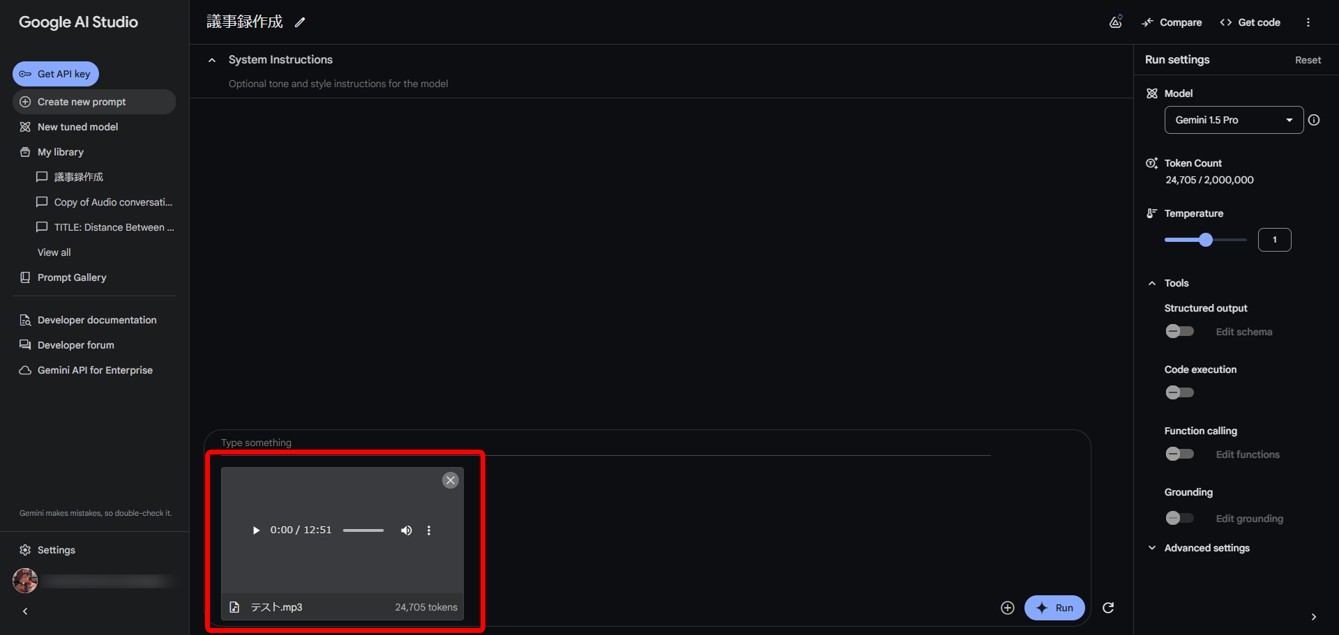 右側にある「Run」ボタンを押すと、Geminiが文字起こしを開始します。