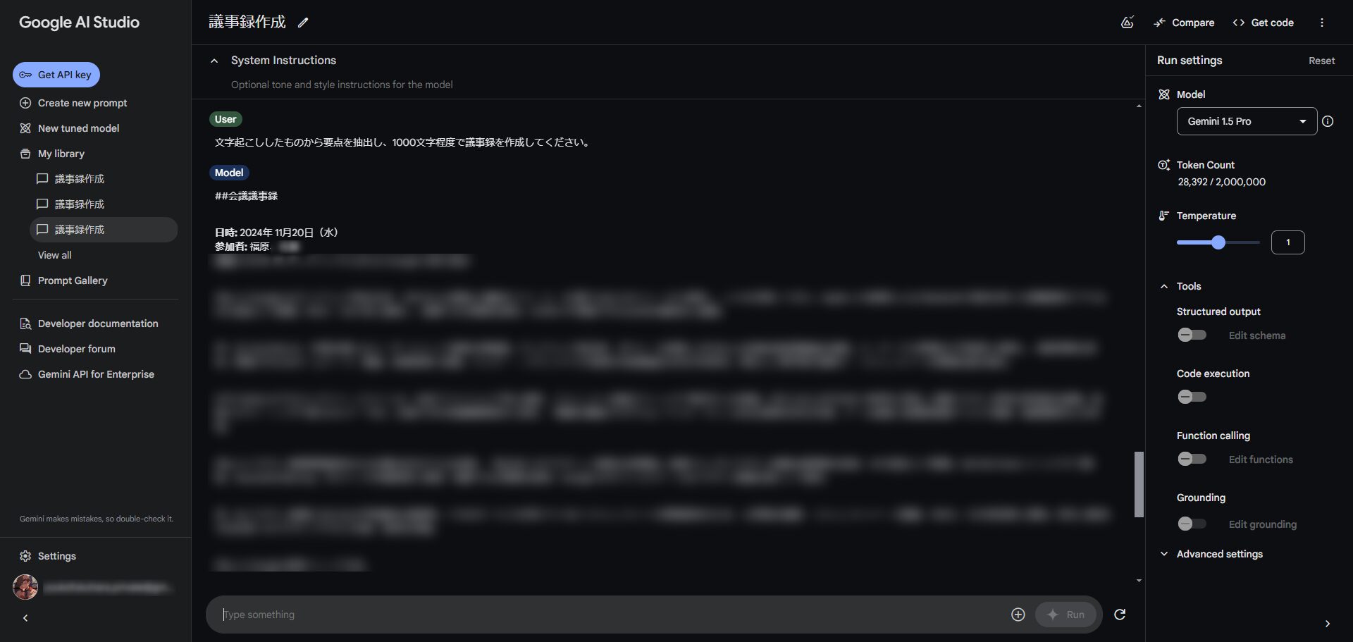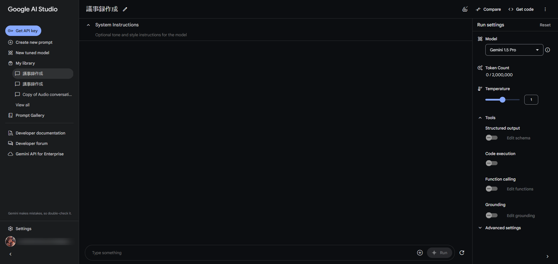 Geminiで議事録作成したい場合には、Google AI StudioからGeminiを利用する必要があります。