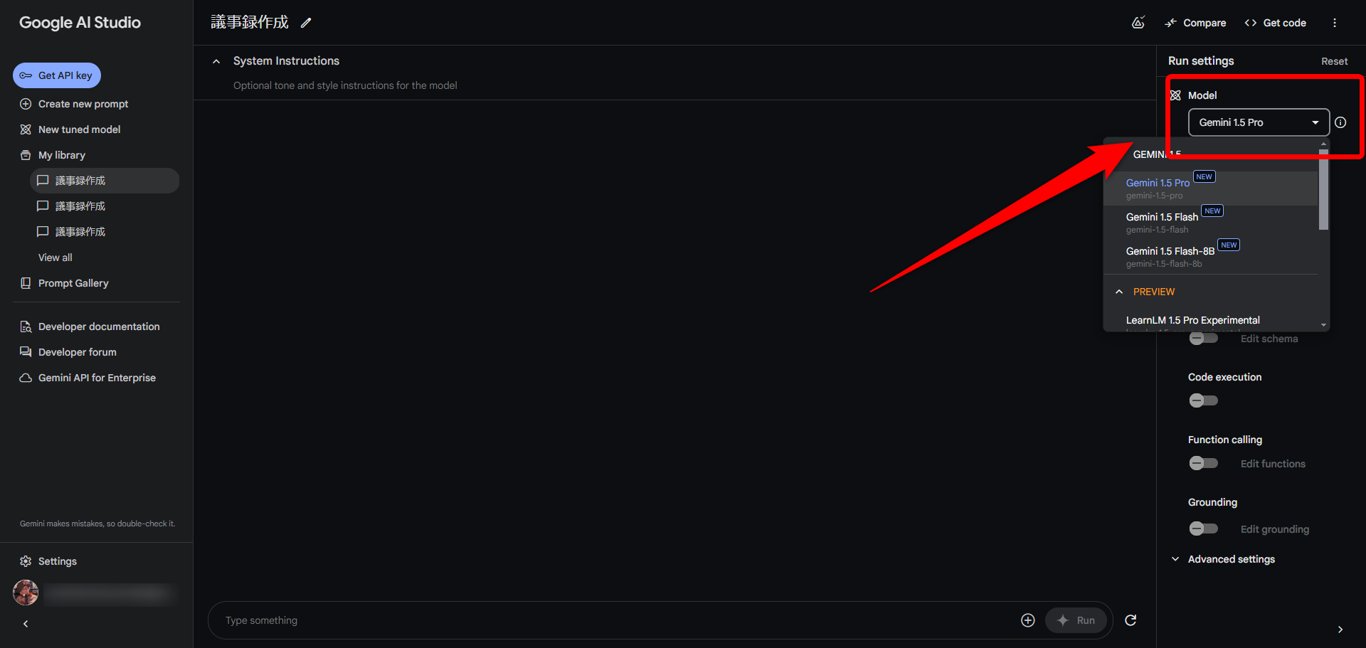 - Gemini 1.5 Pro(最高性能モデル)を選択する