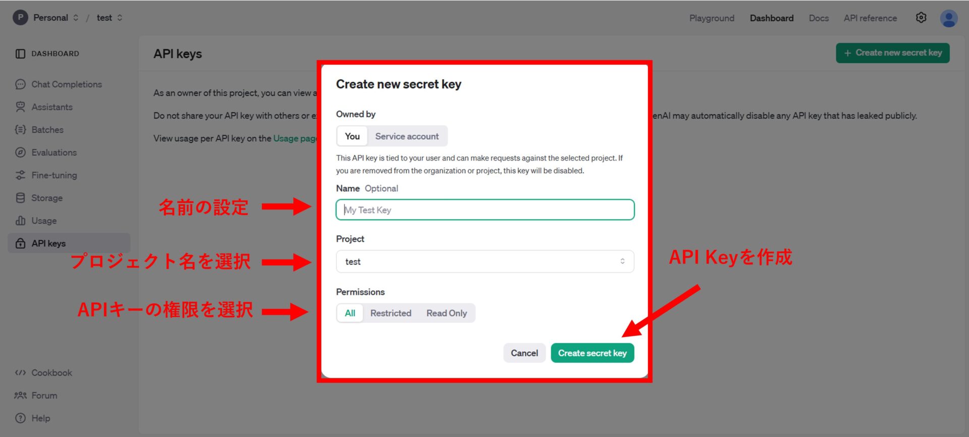 API Keyの名前、プロジェクト名、権限を設定し、「Create secret key」をクリックします。