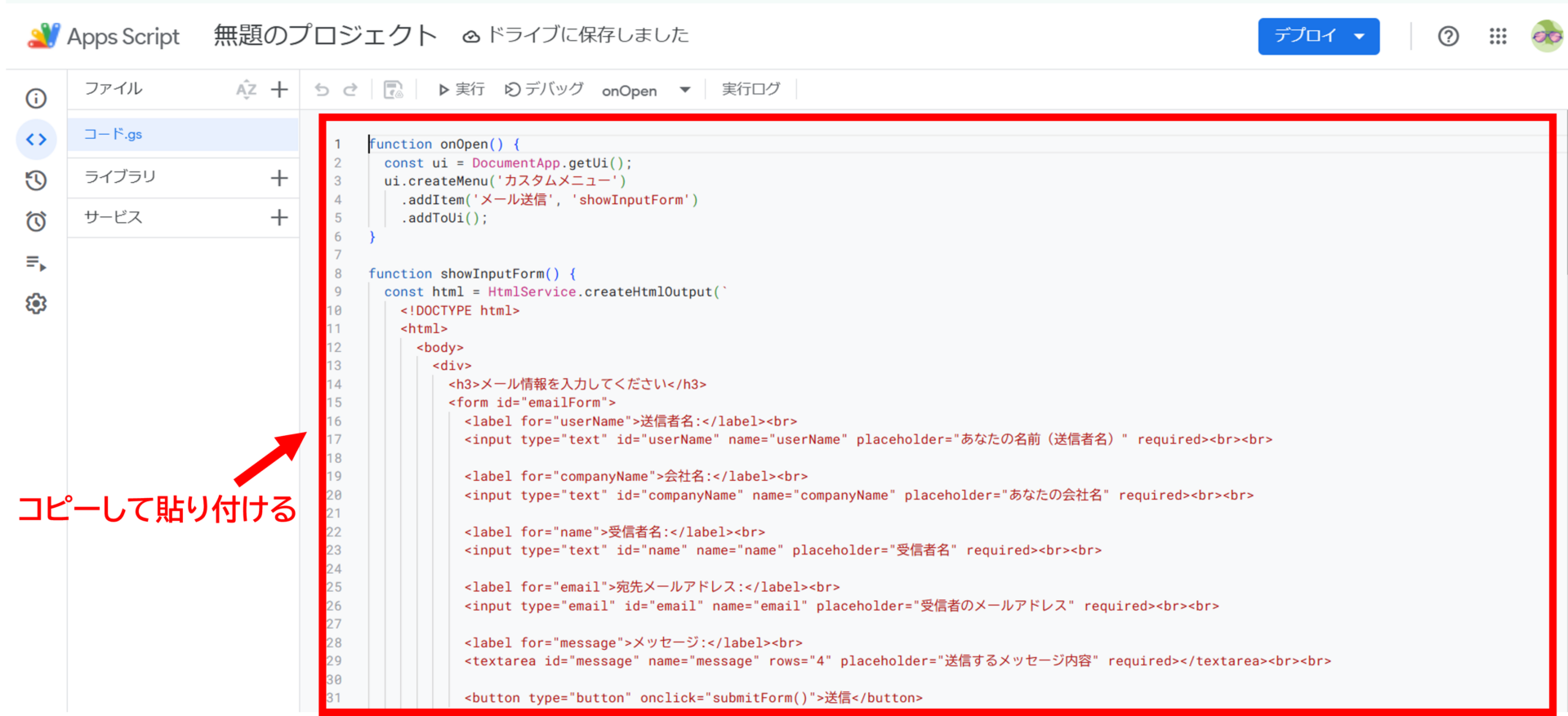 次に、メール自動化を行うためのスクリプトをGoogle Apps Scriptに入力します。