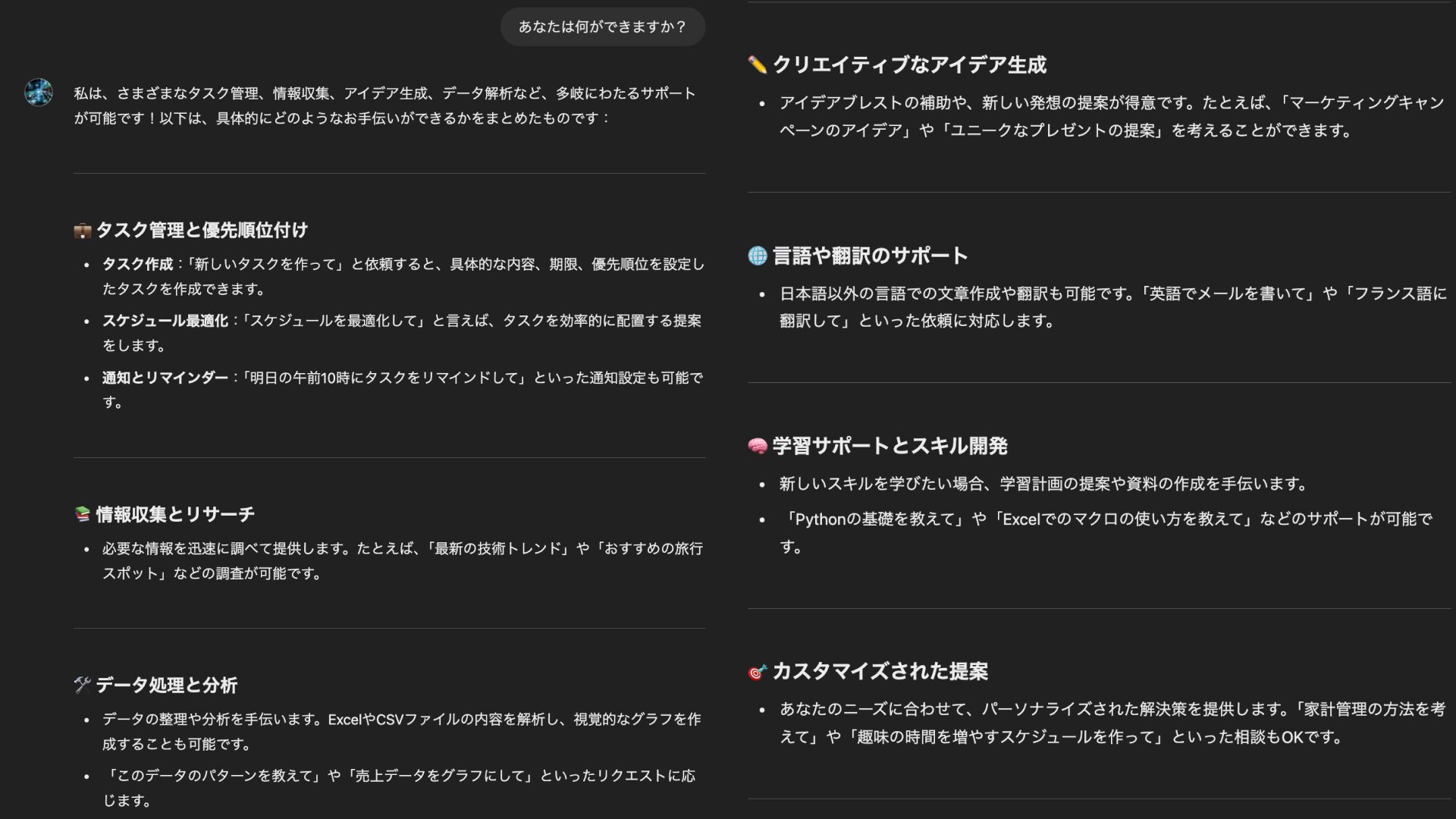 できることをスケジュール管理GPTに聞いてみると、以下の回答が得られました。回答からも、スケジュール管理に必要なさまざまな機能があるとわかります。