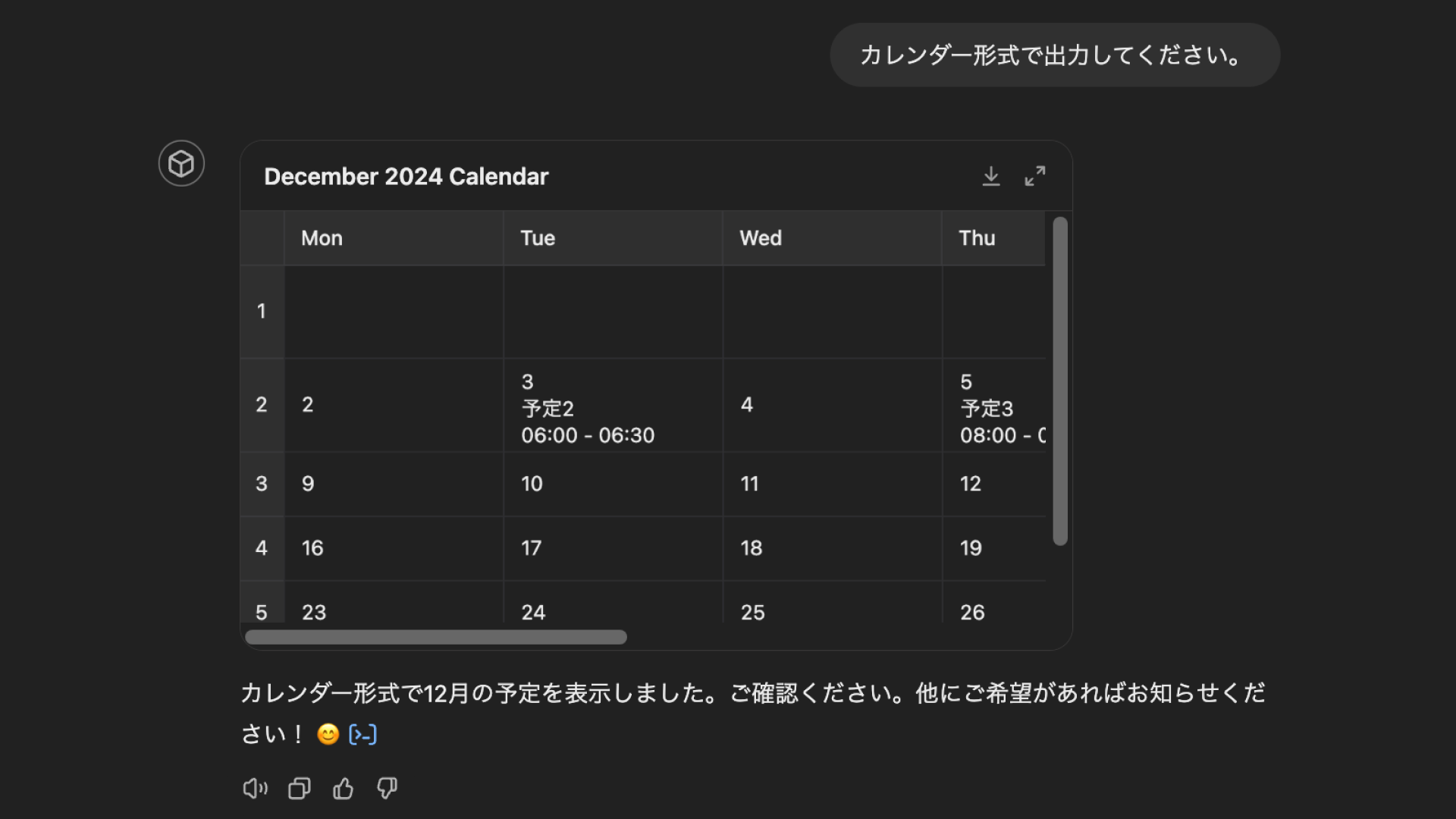 抽出した予定は、スケジュール管理GPT上でもカレンダー形式にして出力できます。