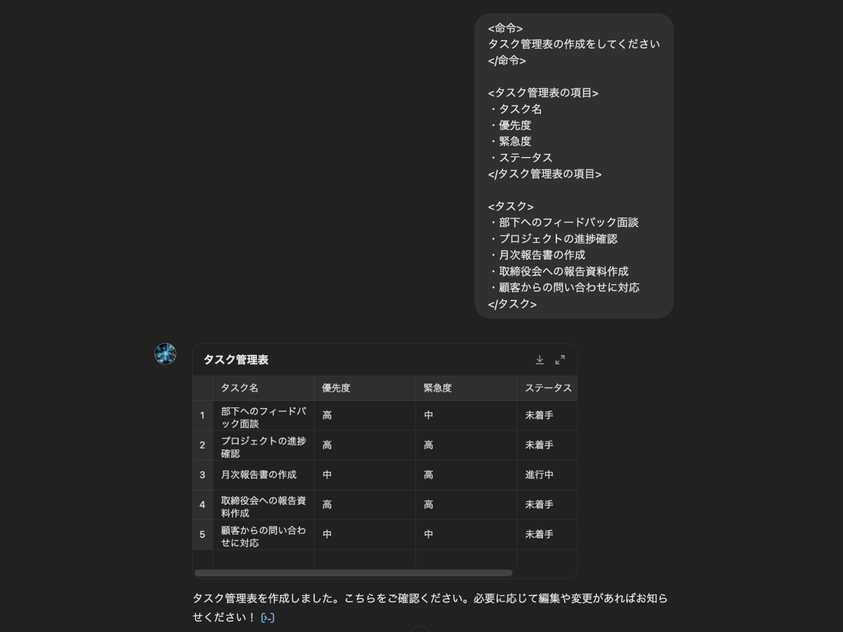 タスク管理についても、シンプルで使いやすい点が魅力です。タスク表を作成するよう指示してみると、以下のように表を作成してくれました。