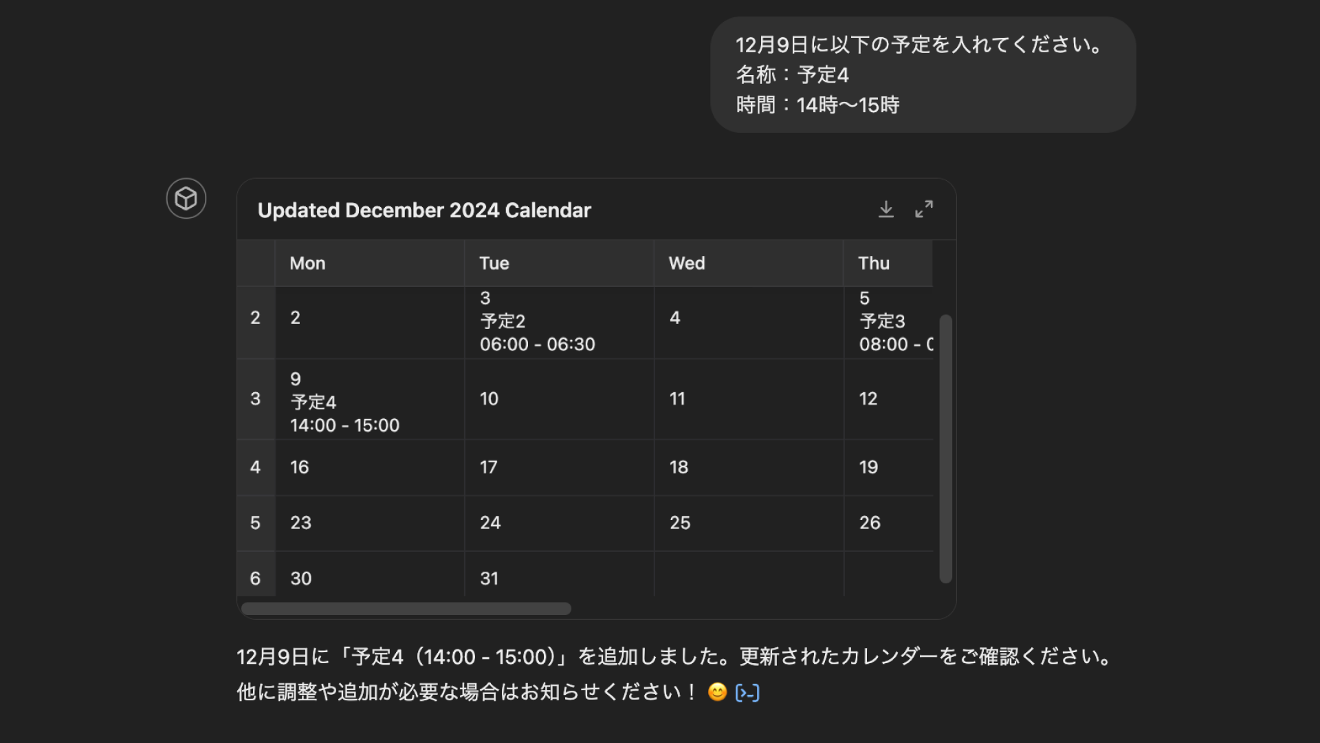 以下の画像は、筆者のGoogleカレンダーを送信し、12月のスケジュールのみを出力してもらった様子です。