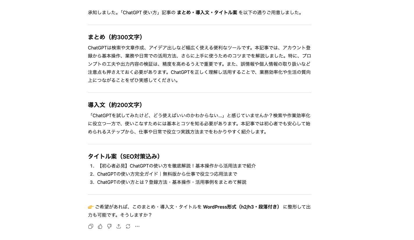 まとめ・導入文・タイトルは、本文作成後にプロンプトを別途入力します。ChatGPTに本文の内容を踏まえたまとめなどを作成してもらうことで、記事内容とマッチします。