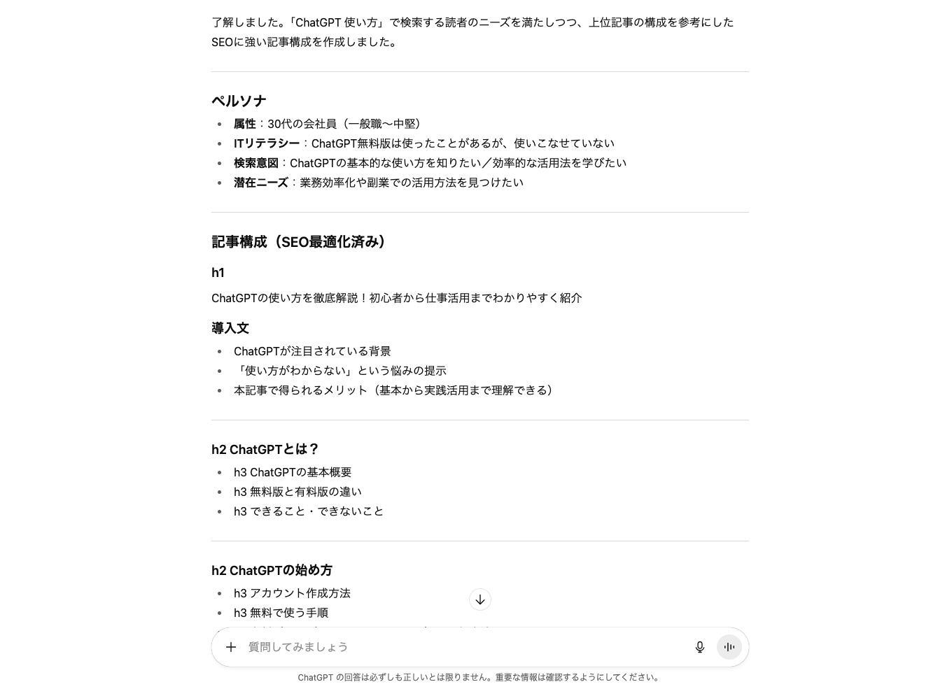 ペルソナを設定したら、ChatGPTを使って構成のアウトラインを先に作成しましょう。理由として、ChatGPTで構成案と本文の作成を同時に行うと出力の品質が低下するためです。