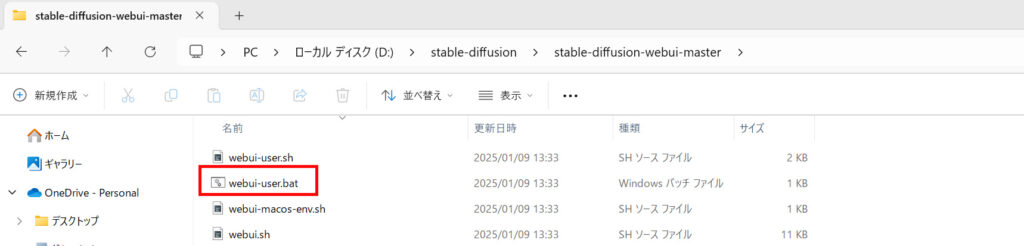 初回の設定後は、「webui-user.bat」を実行するだけで、Stable Diffusionを起動できます。