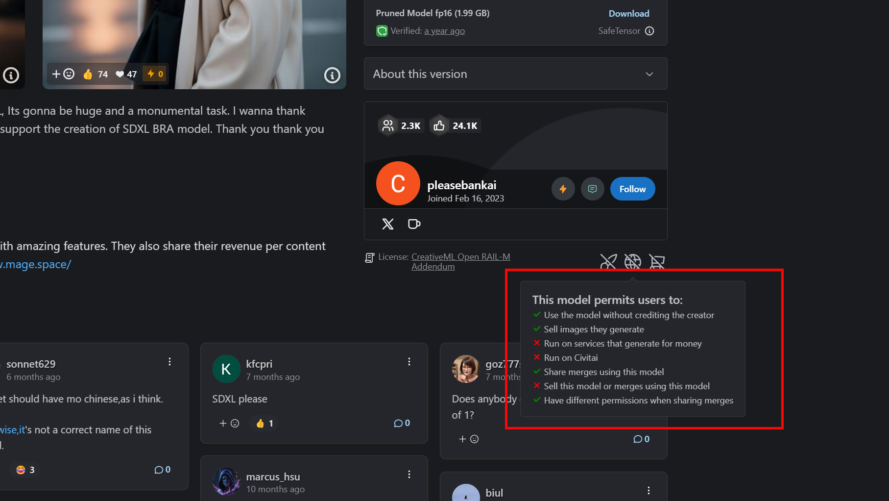 Civitaiで配布されているモデルの場合ライセンスは以下の部分で確認することができます。