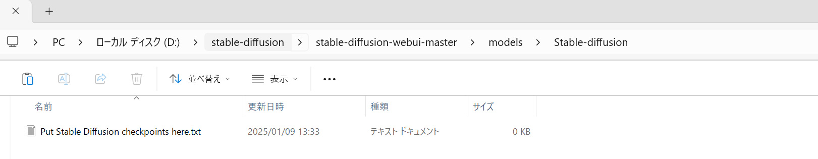 次に、必要なモデルファイル(例: model.ckptまたはmodel.safetensors)をダウンロードします。「stable-diffusion-webui/models/Stable-diffusion」フォルダに配置します。