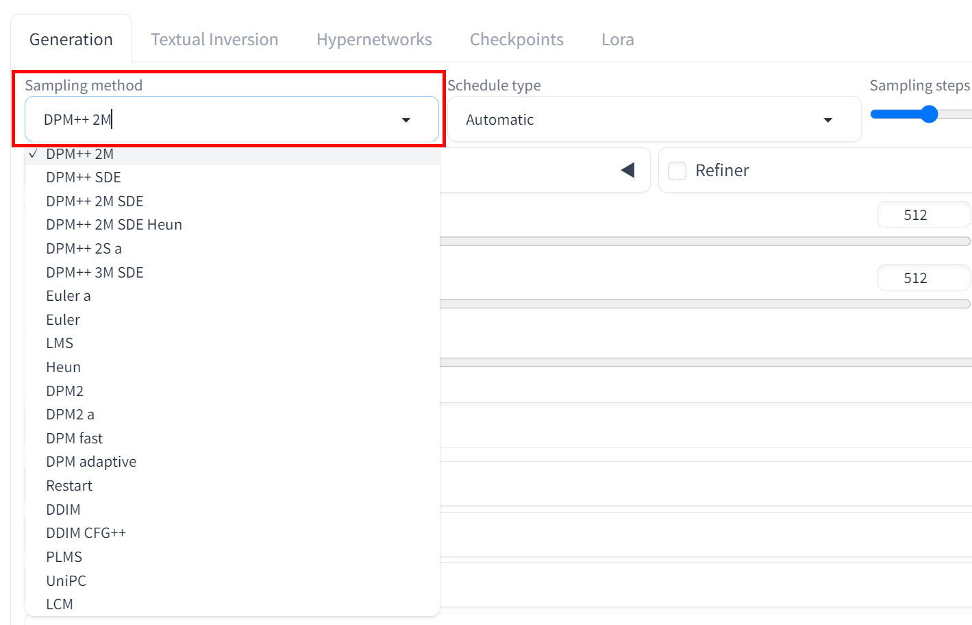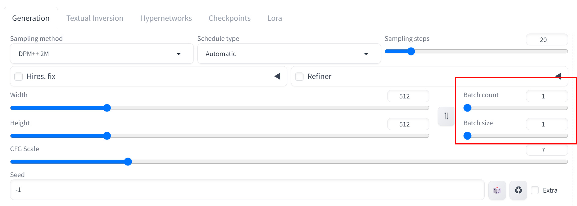 基本サイズは「512×512」もしくは「768×768」を選択し、サンプリングステップは「20-30」、CFG Scaleは「7-12」の範囲で設定しましょう。