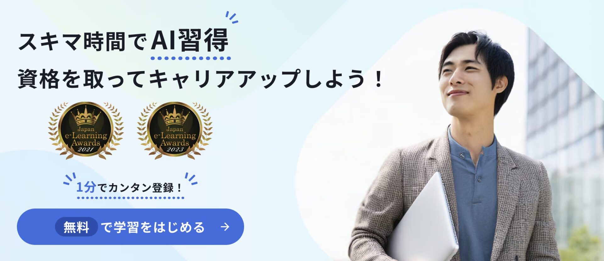 | スキルアップAI | – AI特化のスクールで、実務で役立つカリキュラムとサポートが特徴 – オンライン完結型でいつでも学べる – ディープラーニング協会認定資格のサポートコースもあり | コースにより異なる (公式サイト参照) | – AIエンジニアを目指す方 – ビジネスにAI活用を取り入れたい方 – 資格取得で客観的なスキル証明をしたい方 |