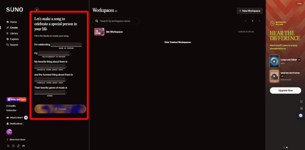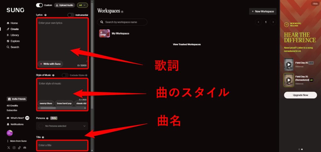 画面左部にメニューがあり、ここから、Suno AIの5つの機能にアクセスできます。