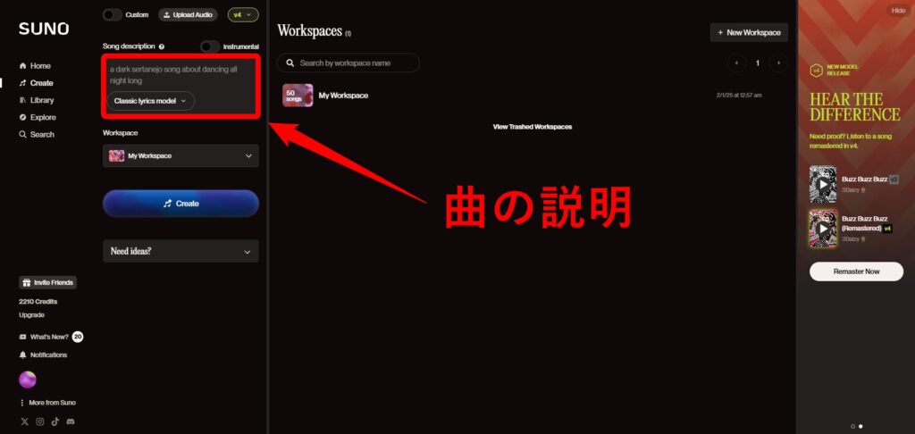 「Create」をクリックすると、「Song description(曲の概要)」を入力する画面が開かれます。入力欄にプロンプト(指示文)を入力し、青い「Create」ボタンを押すと生成が始まります。