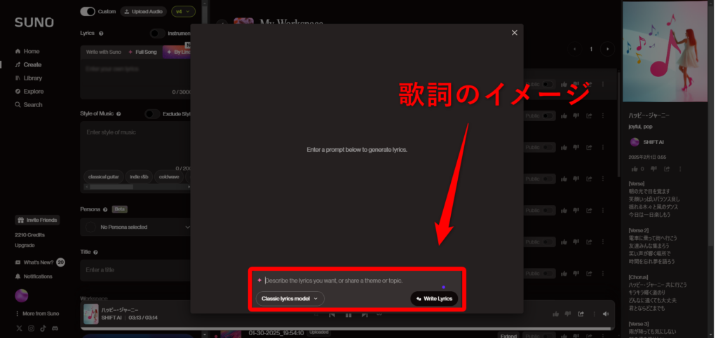 また、歌詞は「Write with Suno」機能を使用して、自動で考えてもらう方法もあります。