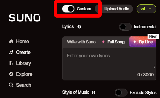 「Custom(カスタム)」モードでより細かいスタイルや歌詞を指定して生成する