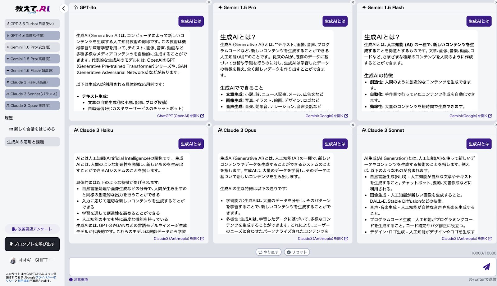 1つの質問に対し、複数の生成AIから同時に回答を得て比較するのも効果的です。