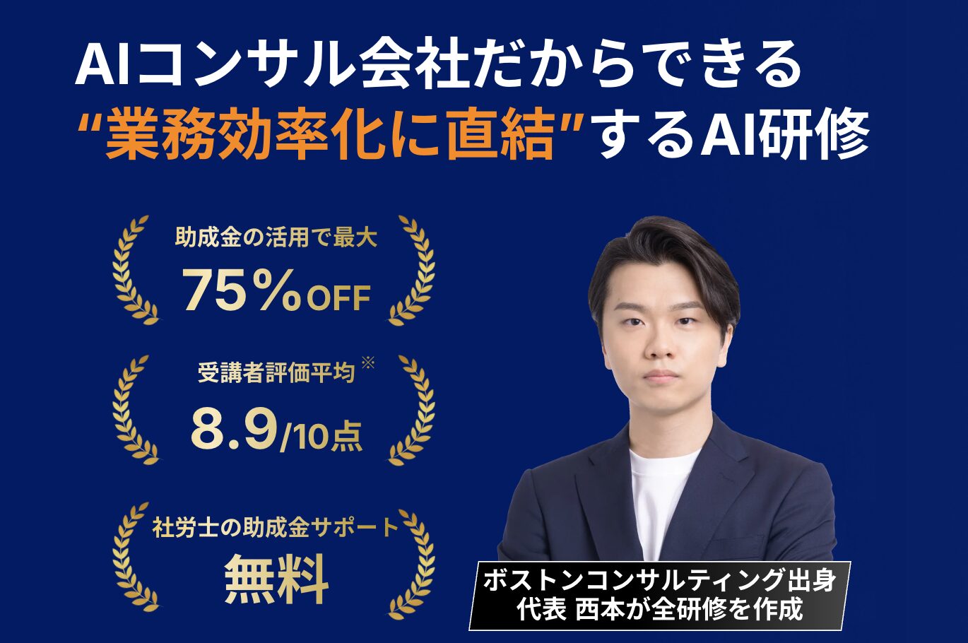 - 幅広い業界のリーディングカンパニーへのAI活用支援実績のあるボストンコンサルティング出身の代表西本が全研修を設計・監修