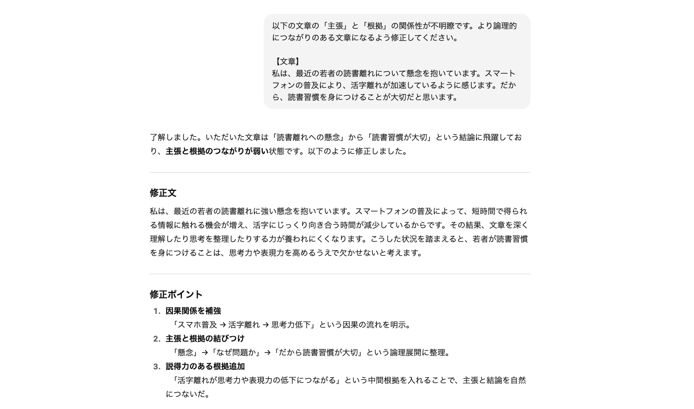 - 不自然な流れや論理の飛躍がある文章の改善点を見つけ、論理的な文章になるように具体的な修正案を示す