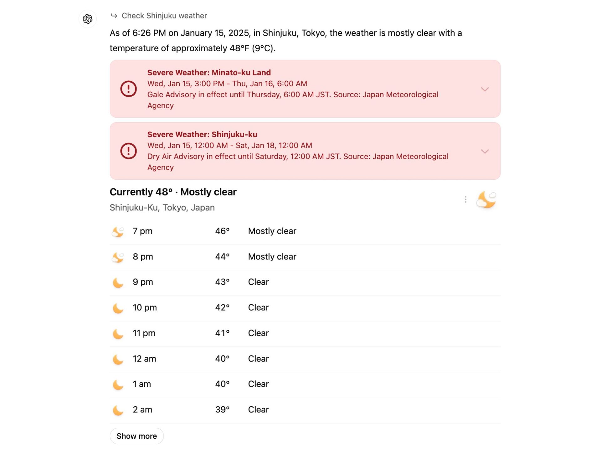 参照したデータ元も示しつつ、具体的な天気から外出時の注意まで教えてくれました。