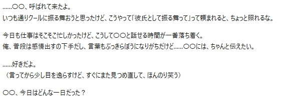 素っ気なさはあるものの、愛情深いクール系彼氏が出力されました。