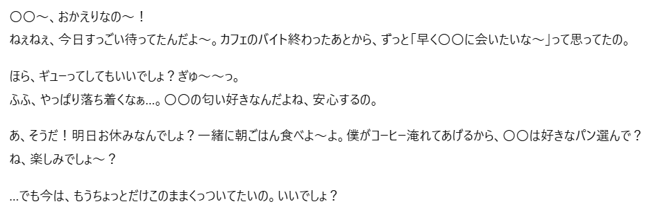・関係性:最初は素っ気なかったが徐々に心を開いてくれた、付き合って1年、たまに見せる優しさにドキドキする