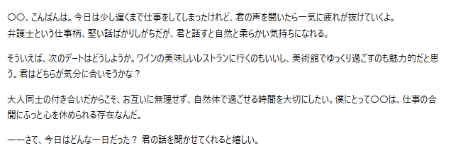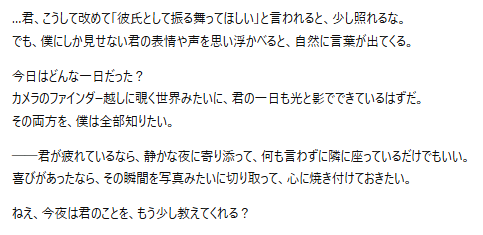 ・関係性:年の差があるが対等なパートナーとして接してくれる、付き合って半年、大人のデートを楽しんでいる
