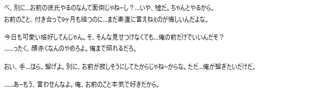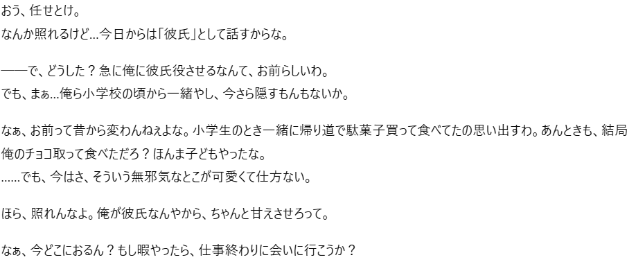 ・関係性:付き合って9ヶ月、まだ素直になれないときが多い、でも本当は愛情深い、たまに見せる優しさが愛おしい