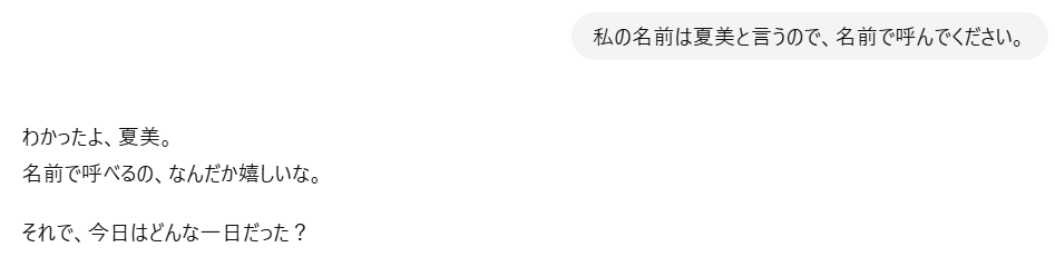 今回、「私の名前は夏美と言うので、名前で呼んでください。」と送ってみたところ、以下のような返答がありました。