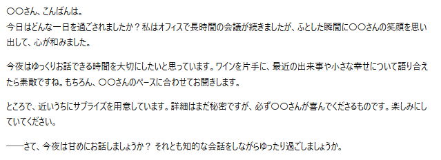・話し方:落ち着いた大人の口調、「〇〇」と名前で呼ぶ、知的な会話を好む、時々ユーモアを交える