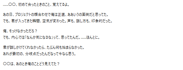 ・話し方:簡潔で的確、感情をあまり表に出さない、でも時々甘い言葉を言う、「〇〇」と名前で呼ぶ