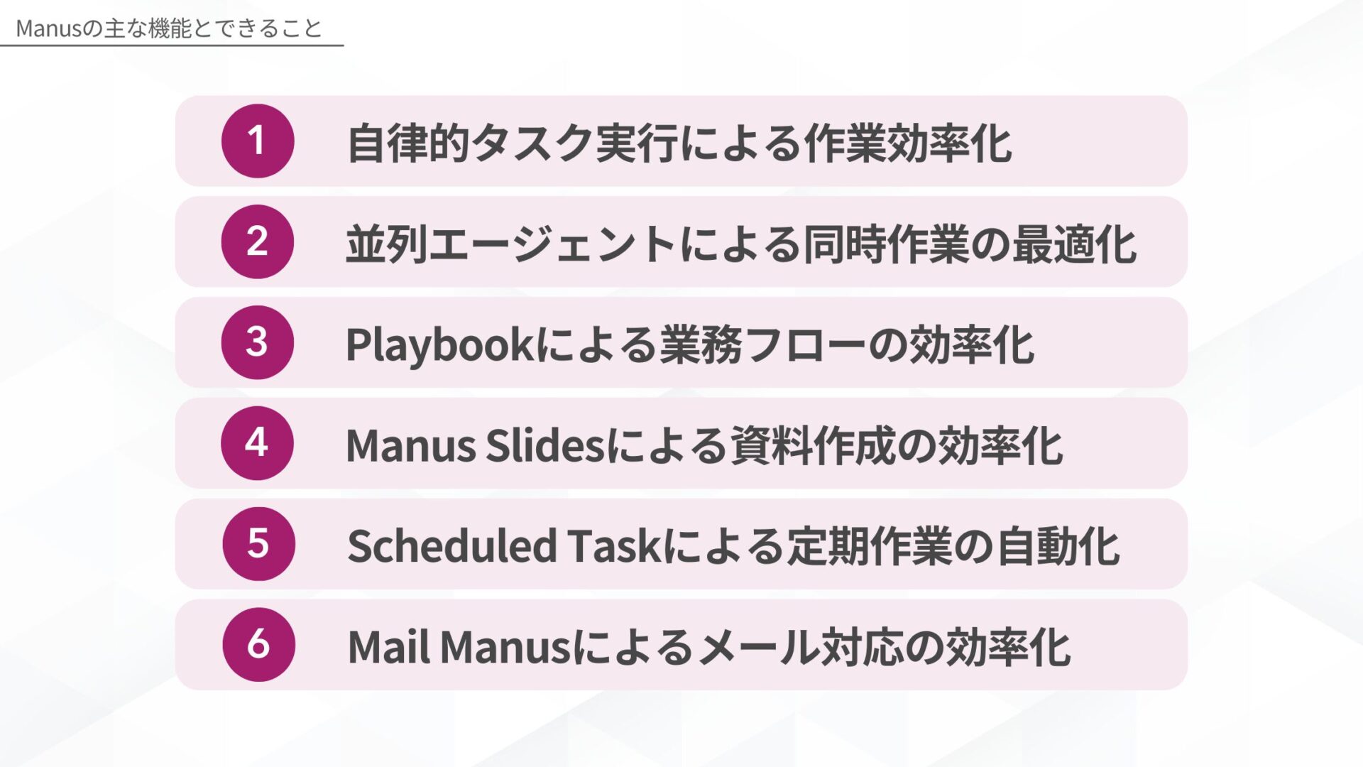 読み終える頃には、「Manusをどう使えばいいか」「どのような場面で役立つのか」が具体的にイメージでき、すぐに業務や情報収集に活用できるようになるでしょう。