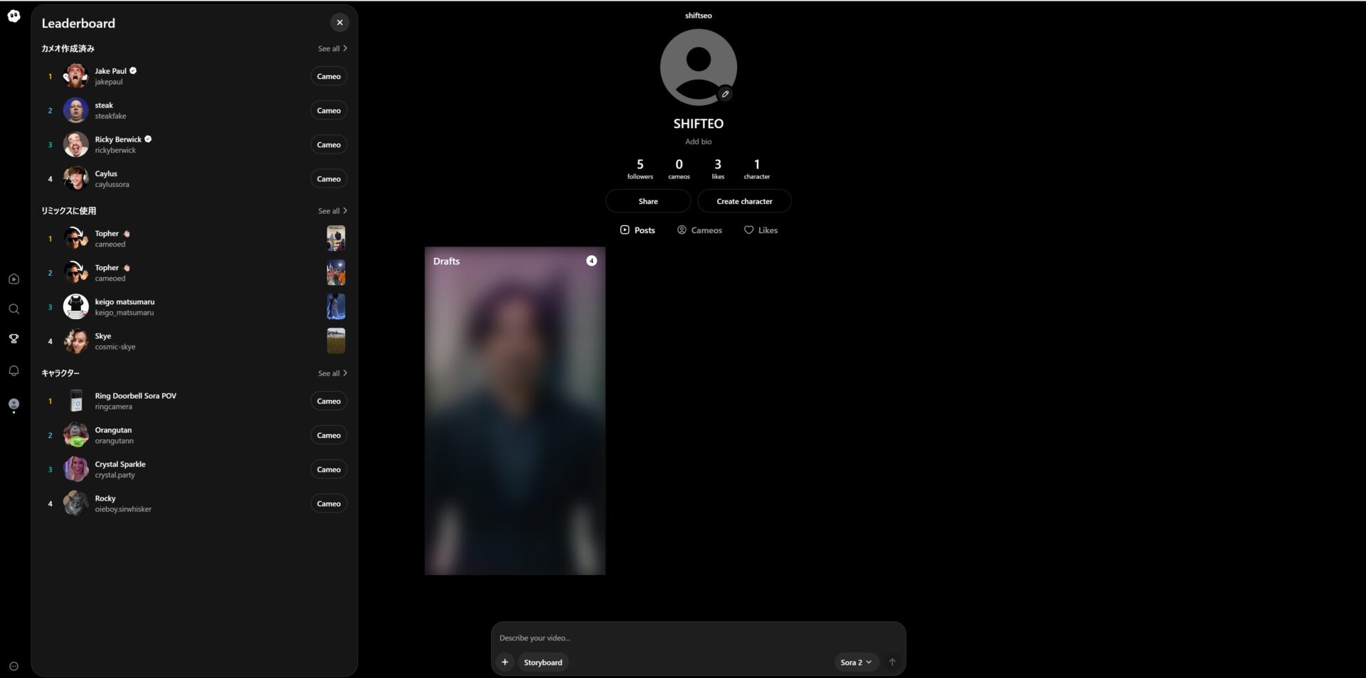 「Sora」アプリでは、自分の顔写真を一度登録するだけでAI生成動画に自分自身を登場させられる「Cameo(カメオ)」機能が備わっています。