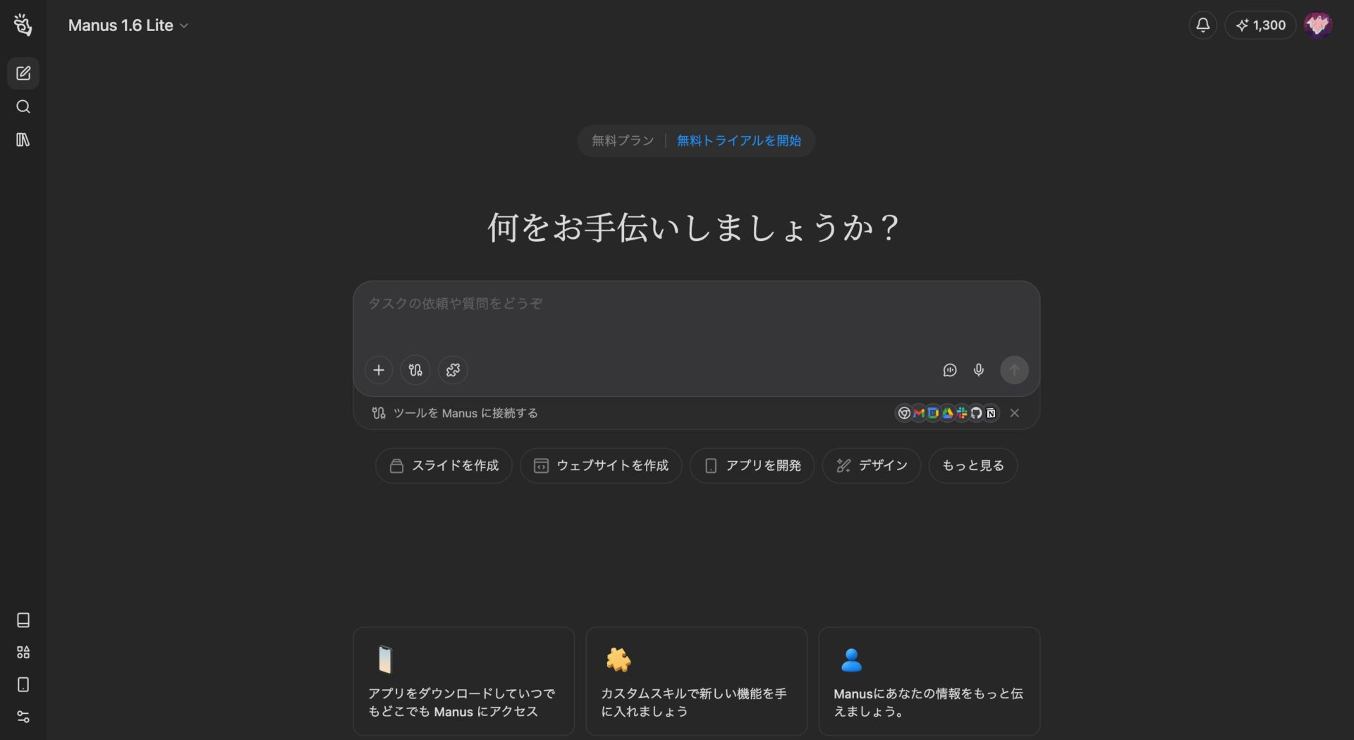 | AIエージェント | Manus | ★★★☆☆ | ・調査から資料作成までを一気通貫で自動化 ・タスクを分解して順次実行できる | 処理に時間がかかる | ・Free:無料 ・Pro:$20・$40・$200/月 | ・調査レポート作成 ・企画書/資料の下書き | ・ビジネスパーソン ・リサーチ業務が多い人 | 可 |