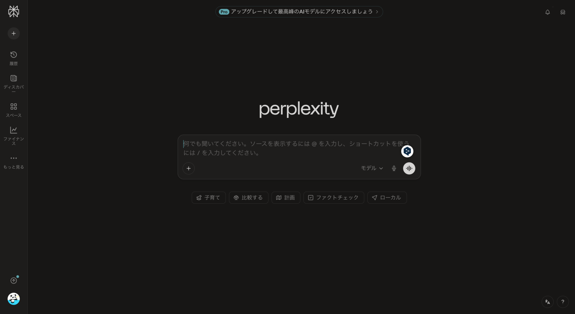 | Perplexity | ★★★☆☆ | ・出典付き回答 ・検索が得意 | 文章表現は控えめ | ・Free:無料 ・Pro:$20/月 ・Max:$200/月 | ・リサーチ ・調べもの中心 | 調査重視の人 | 可 |