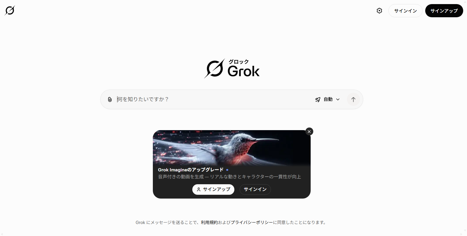 | Grok | ★★★★☆ | ・最新ニュースに強い ・トレンド把握が速い | 真面目用途に不向き | ・Free:無料 ・SuperGrok:$30/月 ・SuperGrok Heavy:$300/月 | トレンド調査 | SNS利用者 | 可 |