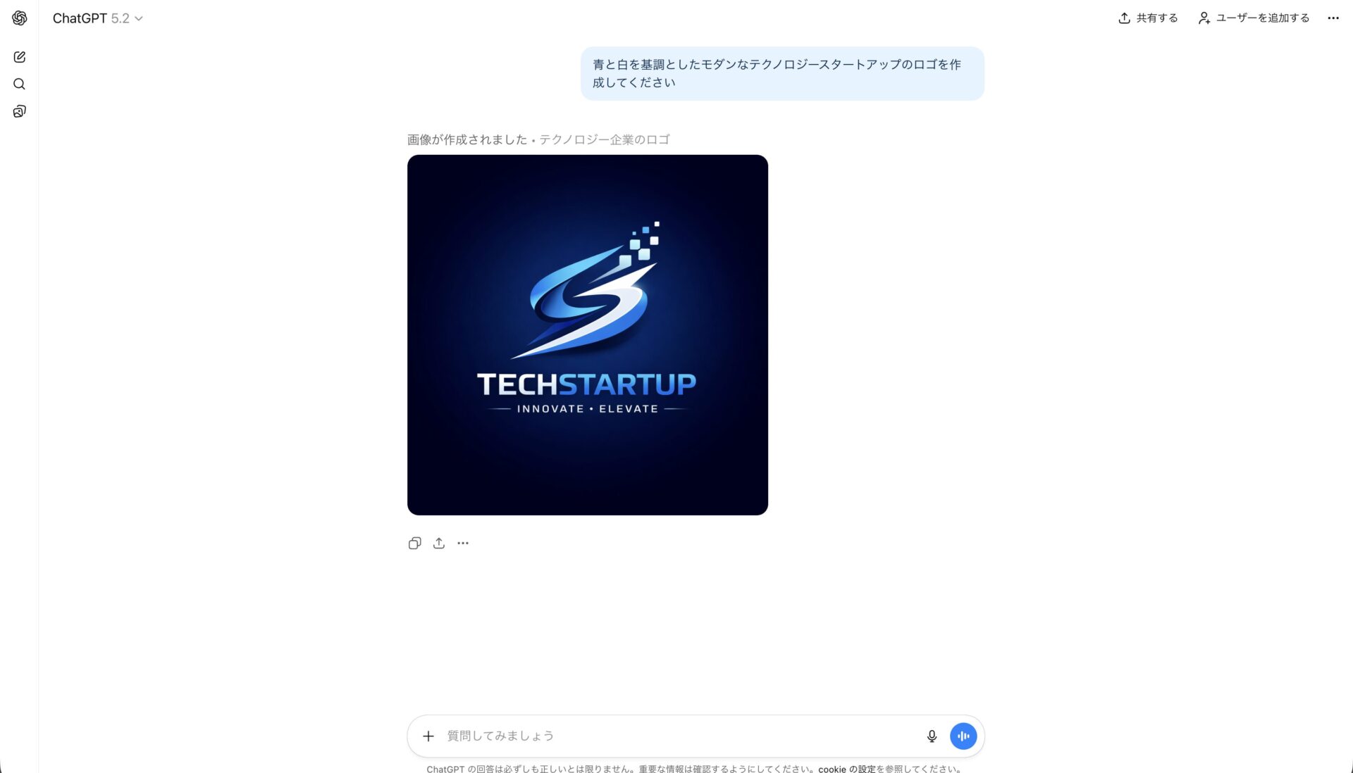 まず、ChatGPTに対して具体的な指示を与えます。「青と白を基調としたモダンなテクノロジースタートアップのロゴを作成してください」と指示します。