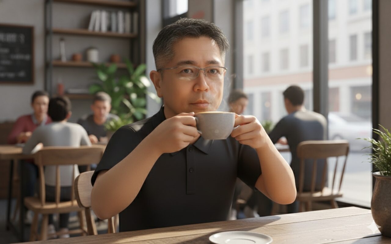[アップロードした画像] の特徴を維持したまま、今度は「カフェでコーヒーを飲んでいる」シーンを生成してください。