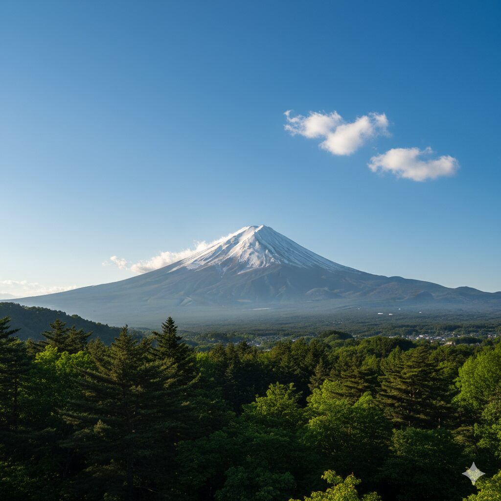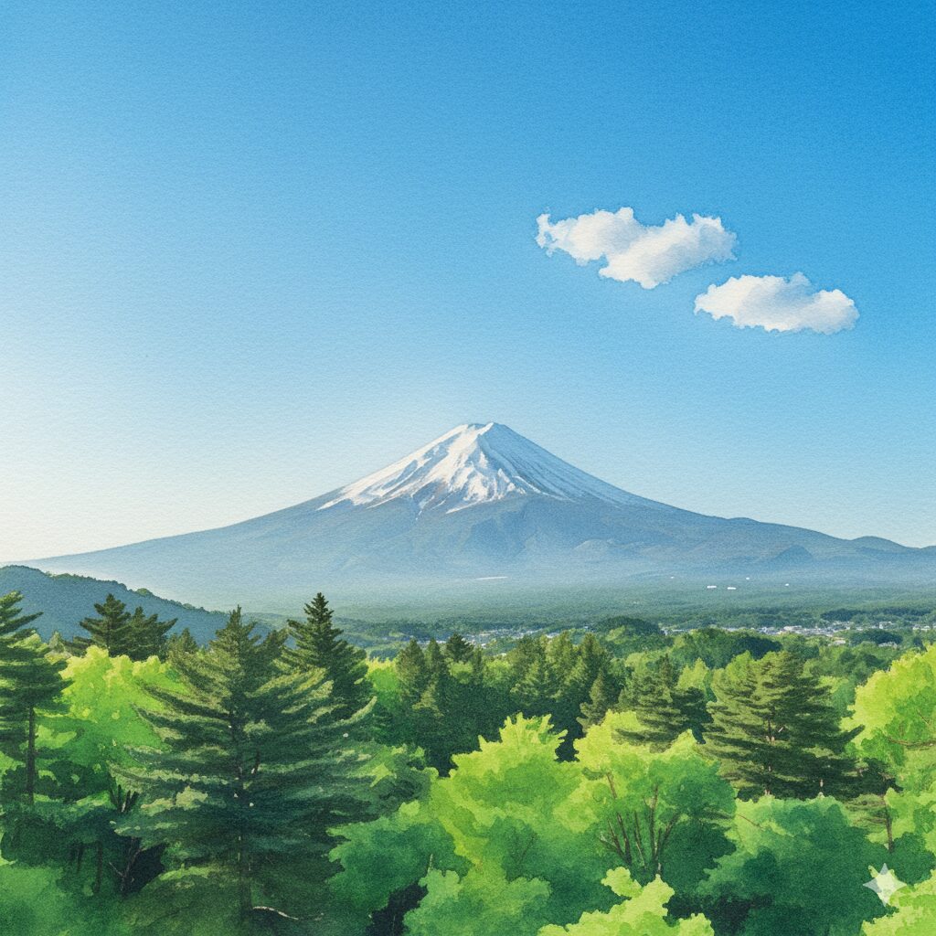 [アップロードした風景写真] のスタイルを、水彩画風に変換してください。空の青と森の緑を、より鮮やかで透明感のある色合いにしてください。