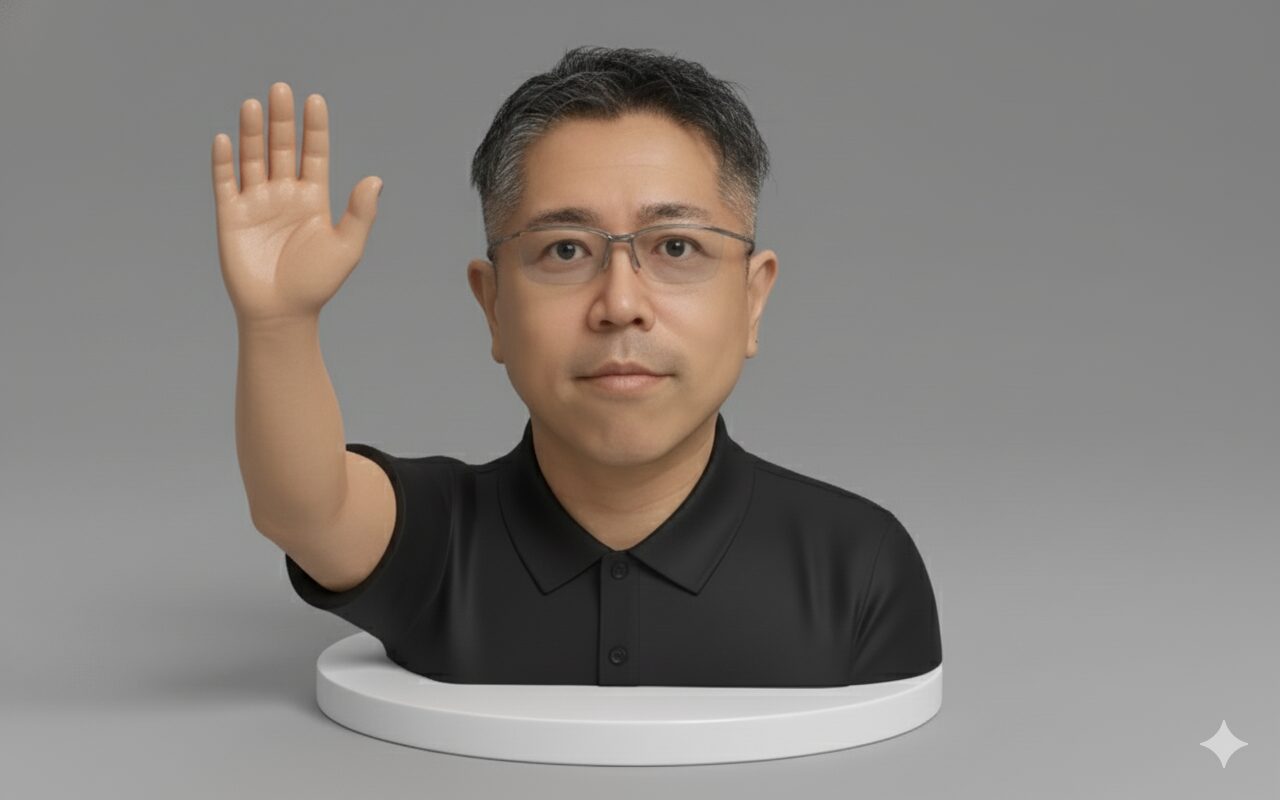 [アップロードした画像] の人物のポーズを、「右手を挙げて挨拶している」ポーズに変更してください。顔の表情、髪型、服装は絶対に維持してください。