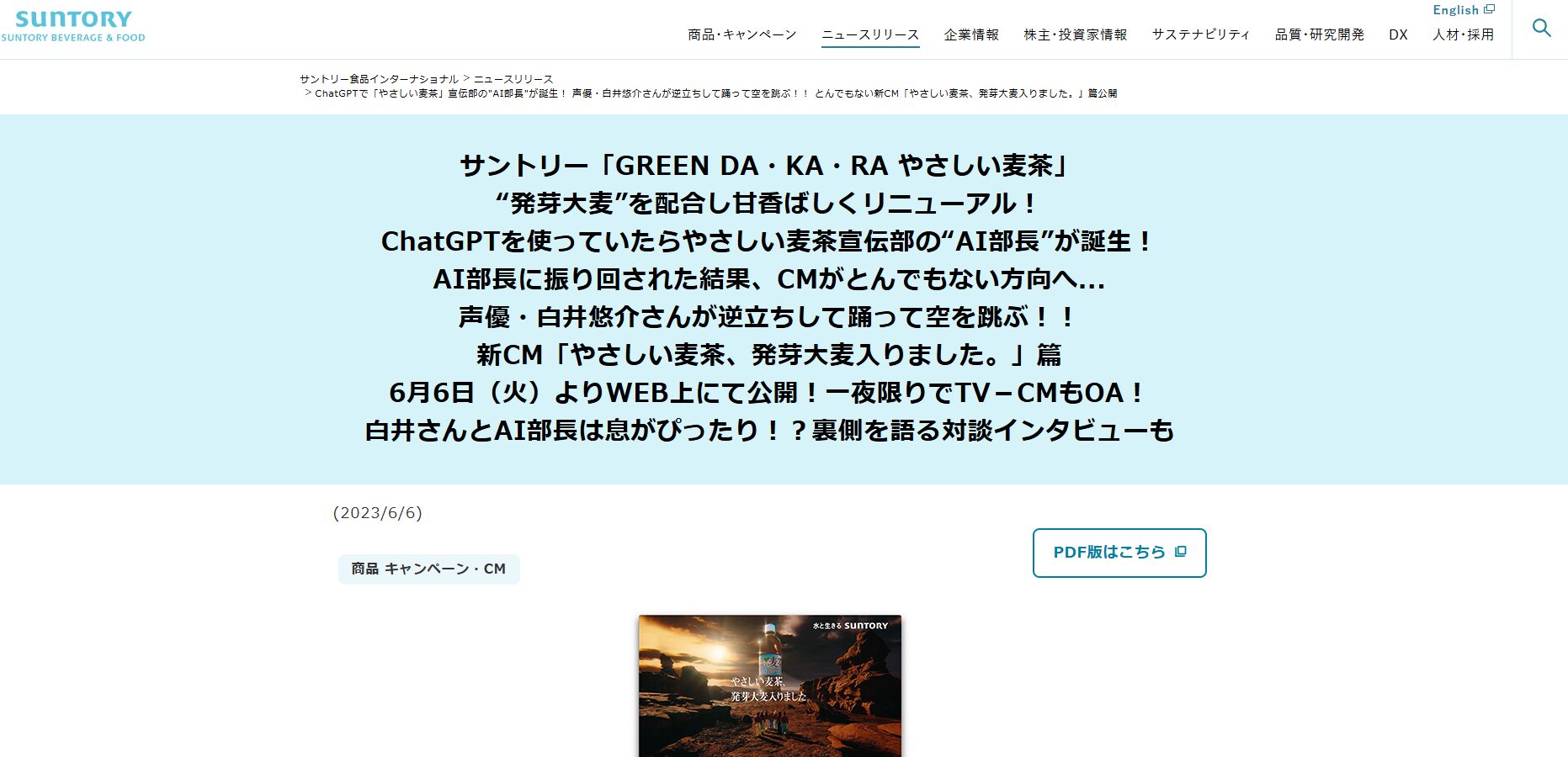 サントリー食品インターナショナルは、「GREEN DA・KA・RA やさしい麦茶」のCM制作において、ChatGPTを「AI部長」として任命しました。