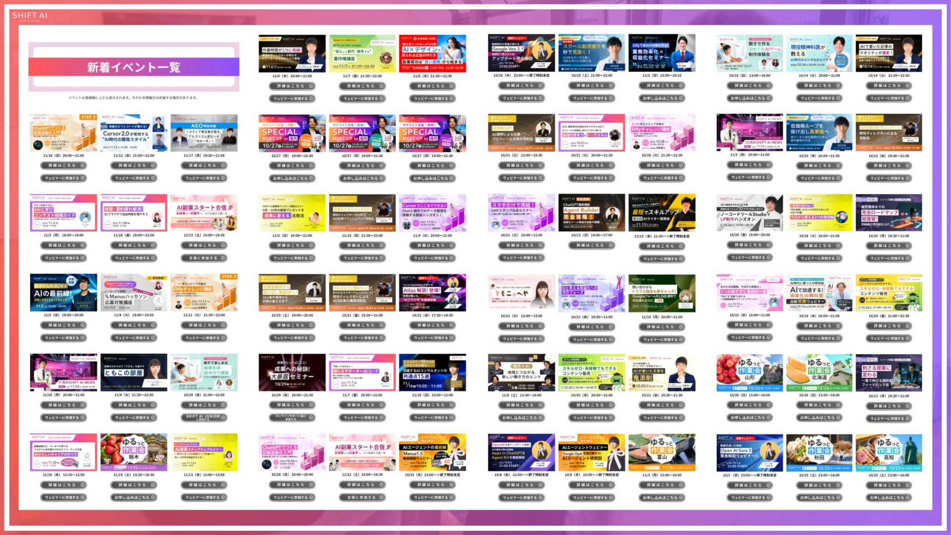 「北海道でAIを学びたいけど自分に合ったスクールはあるかな?」と不安…。オンラインの柔軟性もいいけど、対面ならではの熱量も欲しい…。そんなときは、SHIFT AIのリアルイベントに参加するという方法もあります。SHIFT AIではどんな学び方ができるのか、以下のボタンからごらんください。