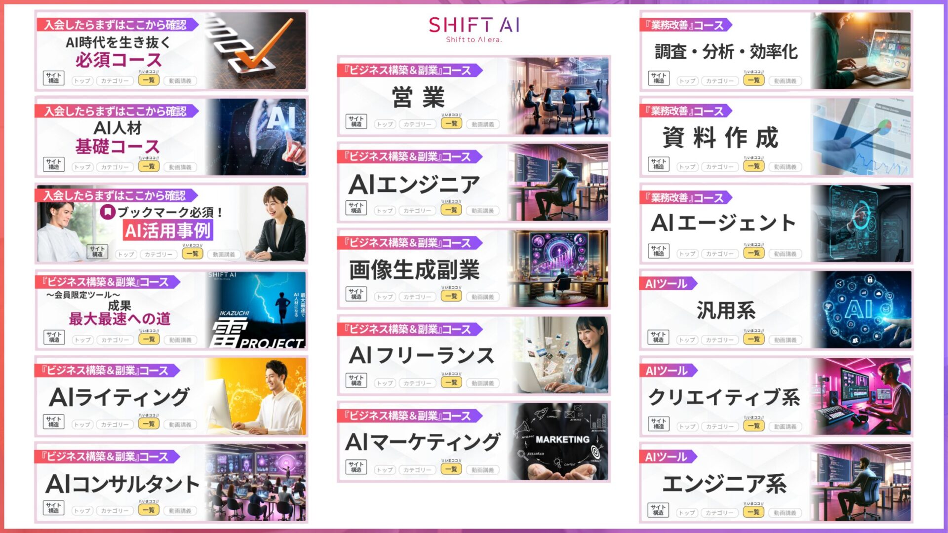 SHIFT AIでは、ChatGPTをはじめとする生成AIツールをどう仕事に結びつけるかに重点を置き、文章作成・プログラミング・画像生成・動画制作など、すぐに実務で使えるスキルを学べます。