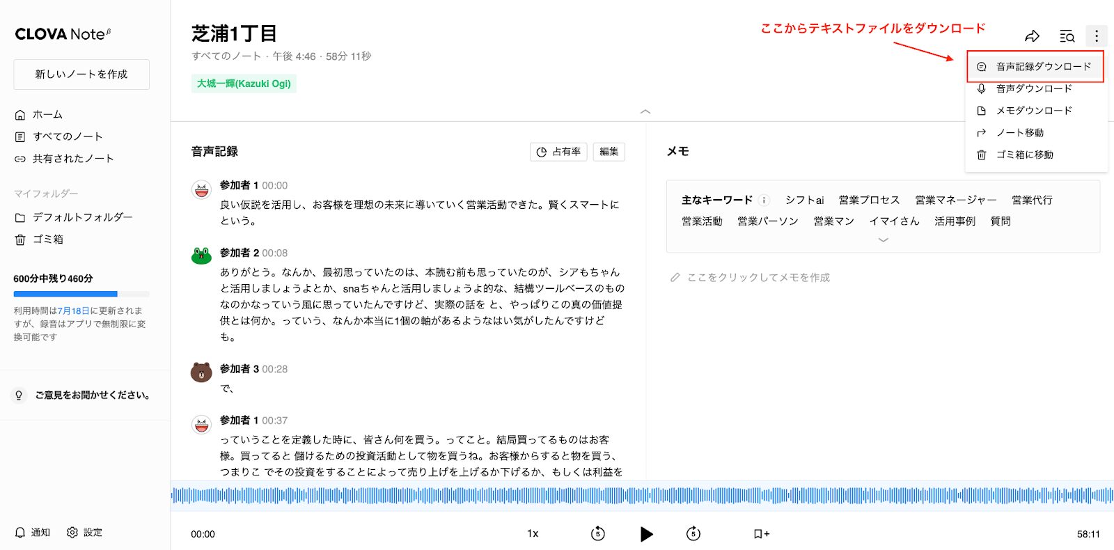 文字起こしが完了したら、画面右上の「もっと見る」から「音声記録ダウンロードを選択して、テキストファイルをダウンロードします。