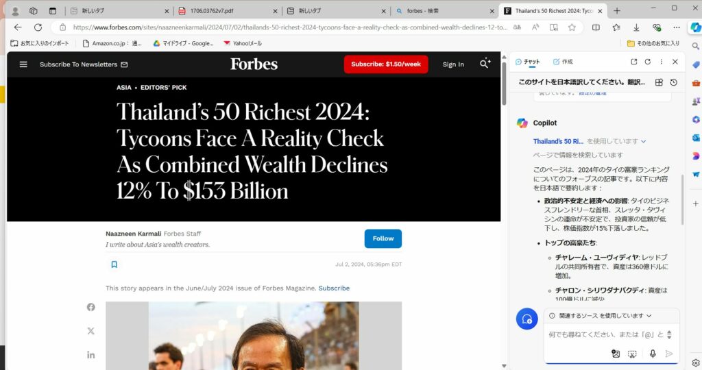 そうすると、英語の記事を翻訳し、瞬時に要約してくれます。従来までは、ページ全体をコピーして、翻訳サイトにペーストする必要がありましたが、Copilotはその場で翻訳・要約をしてくれます。