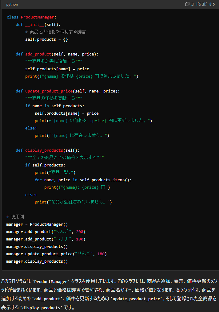 結果、このように商品を追加、表示、および価格を更新する機能を持ったプログラムが生成されました。
