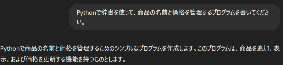 「Pythonで辞書を使って、商品の名前と価格を管理するプログラムを書いてください。」