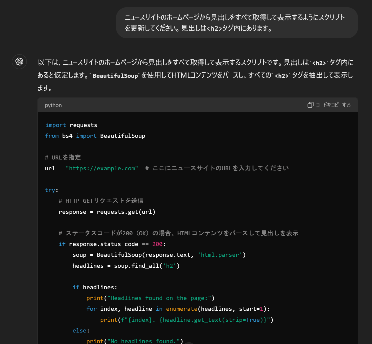 段階的な指示で得られたコードは、見出し一覧を指定URLから抽出できます。