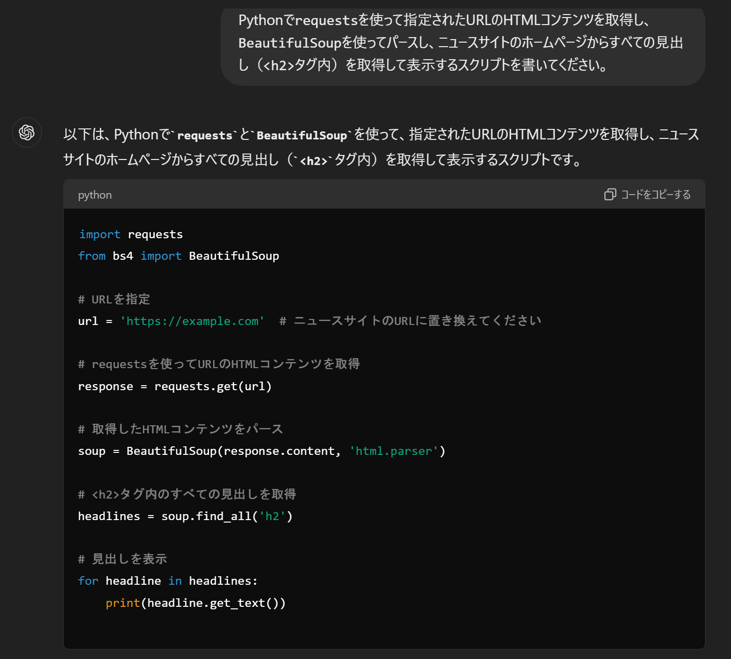 - コード例の取得: ChatGPTに具体的なコードサンプルを生成してもらい、それを実際に動かすなどして、より実践的な学習を行います。たとえば、「リストを操作するコードを教えてください」といった質問をすることで、シンプルな例を手に入れられます。