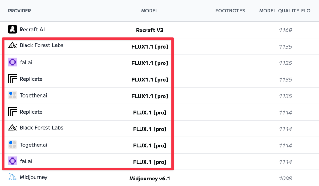 Flux.1は、画像生成AIの分野で長らくトップの座を守っていたMidjourneyを性能面で凌駕しました。Artificial Analysis Text to Image Model Leaderboardというランキングサイトで、Flux.1は2〜8位を独占し、Midjourneyを抜いています。